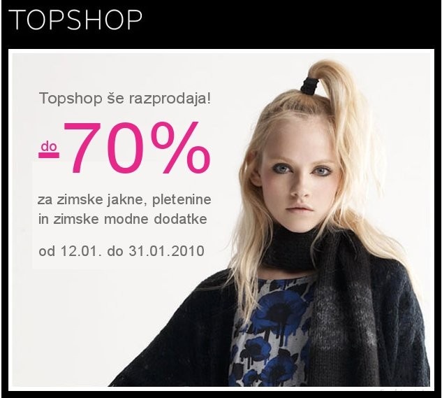 Topshop v trgovini Emporium, Mercator center Domžale in Planet Tuš Koper dodatno razprodaja in znižuje.